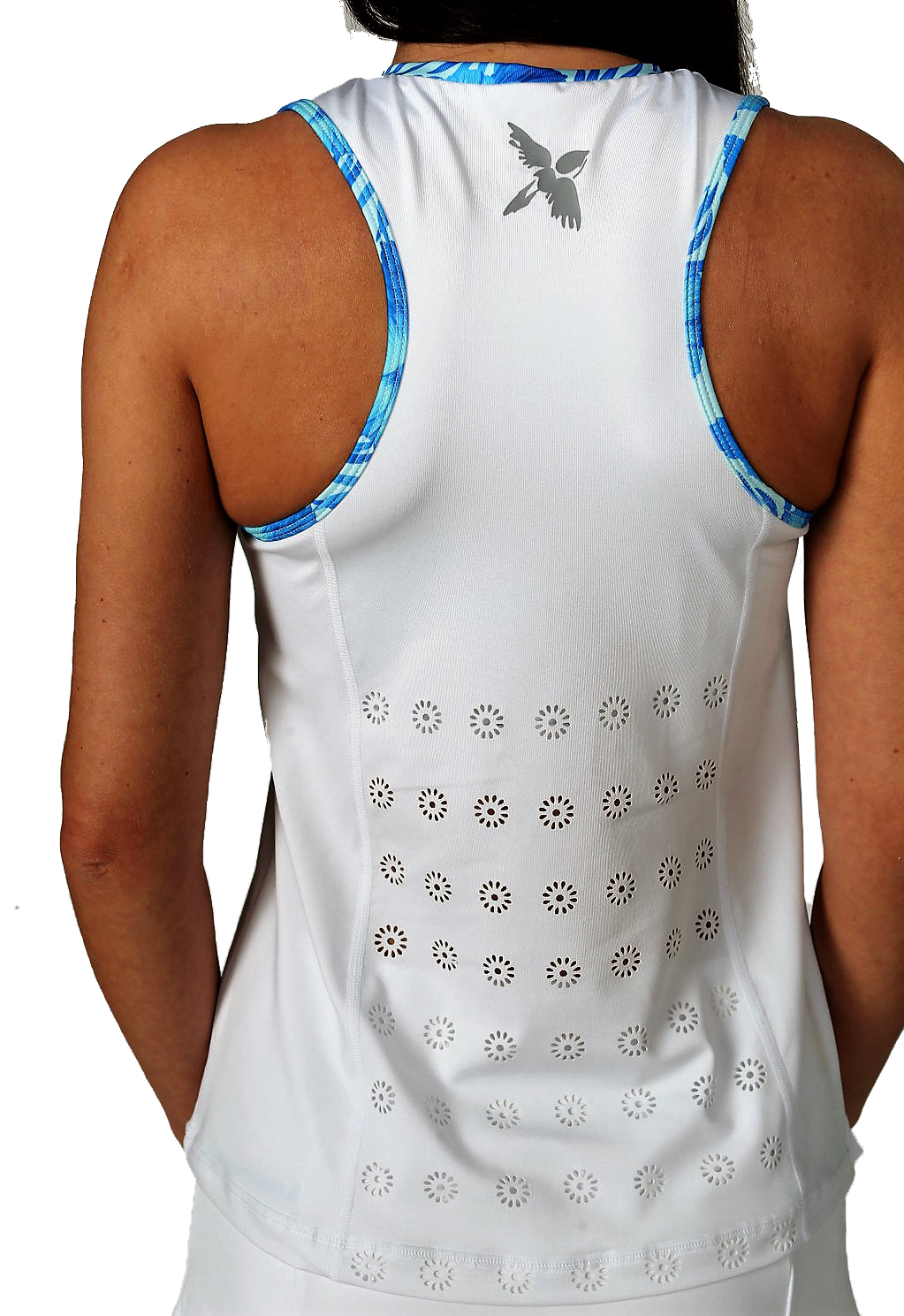 Embrace summer with this stunning V-neck tennis top refined with laser cut edges! Enjoy the breathable experience on the court while sporting a beautiful blue contrast fabric.